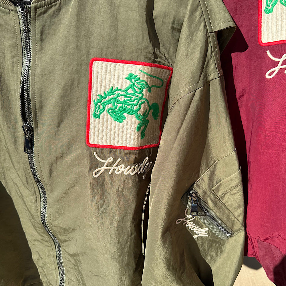 Make a statement in this Western-inspired varsity bomber! Featuring bold cowboy embroidery and “West Coast Rodeo” lettering across the back, this jacket brings cowgirl attitude with a sporty twist. Designed with a lightweight nylon shell, ribbed cuffs and hem, zip-front closure, and handy side and sleeve pockets. The oversized bomber fit makes it perfect for layering over your favorite graphic tee or sweater for that effortless rodeo-ready look.