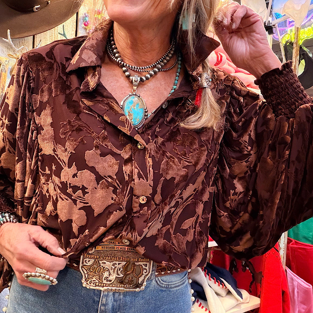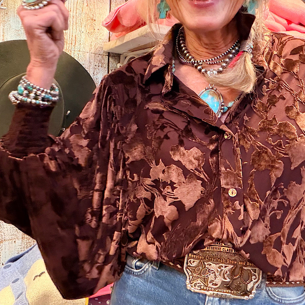 Feminine for any occasion, this blouse features a soft velvet fabrication and floral print design all over, deep gathered poet sleeve with sheered elastic cuff, and button front. So many beautiful details.